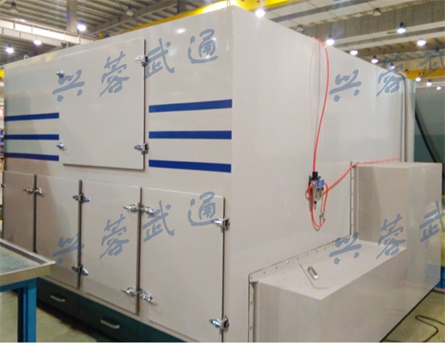 打磨台三侧面及顶面为吸隔声层,用于**打磨工件时产生的混响及向四周传播的噪声。打磨台进出工作一侧安装透明PVC软帘,开启方式为手动,方便人员及工件进出,同时防止打磨台内粉尘向外溢。进出工件一侧相对的一面开有吸风口,用于将粉尘吸入除尘器。在打磨区顶部安装有带罩双管日光灯。在打磨区内安装有气动工具快速接头,分别位于打磨间的侧面及顶部。在打磨区内安装有标准插座方便电动工具接电。