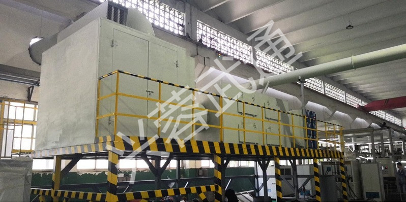 2019年初为重庆某公司车间多台压淬机床设计、制造、安装了一套烟尘\废气净化系统,系统处理风量30000m3/h,主要包括TRION电子空气净化设备、活性炭吸附器、离心风机、联接管道、电气控制等。