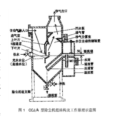 如图1所示,含尘气体由入口进入除尘器,气流转弯向下冲击于水面,部分较大的尘粒落入水中,当含尘气体以18-35m/s的速度通过上下叶片间的S形通道时,激起大量的水花,使水气充分接触,绝大部分微细的尘粒混入水中,使含尘气体得以充分的净化,经曲S形通道后,由于离心力的作用,获得尘粒的水又返回漏斗,净化后的气体由分雾室挡水板除掉水滴后经争气出口和通风机(图中未画)排出除尘机组,泥浆则由漏斗的排浆阀连续或定期的排出,新水则由供水管路补充。