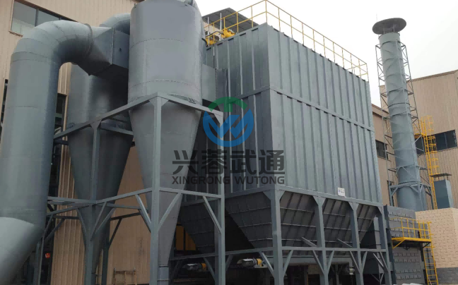 系统由旋风除尘器+气箱式脉冲除尘器+活性炭箱组成,处理风量113600m3/h旋风除尘器